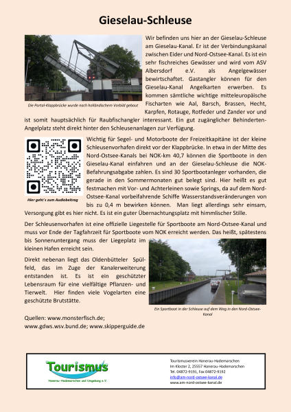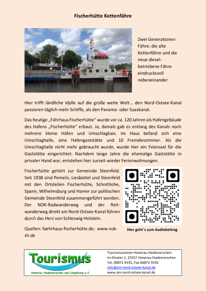 Sie stehen hier an der Fährstelle Fischerhütte, an der sie den Nord-Ostsee-Kanal mit einer modernen Fähre mit Diesel-Motor oder – falls sie gerade hier eingesetzt wird – mit noch modernerem Hybridmotor überqueren können.