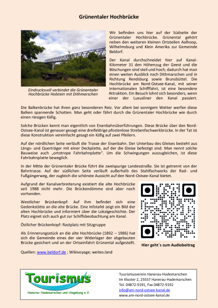 Sie stehen am Nord-Ostsee-Kanal unterhalb der Grünentaler Hochbrücke, die den Kanal an dieser Stelle im Zuge der Landesstrasse 316 und der Eisenbahnlinie von Neumünster nach Büsum in einer lichten Höhe von 42 m über dem Wasserspiegel überquert.